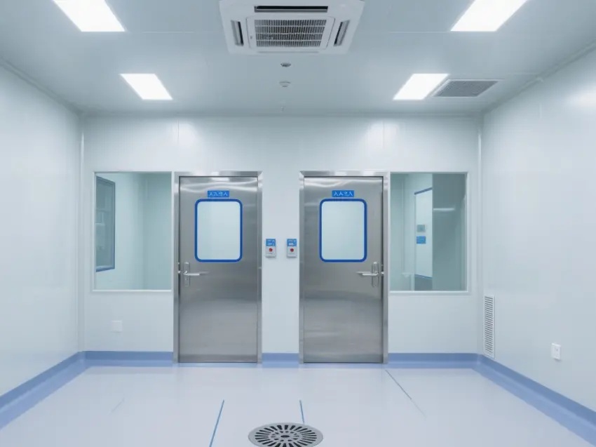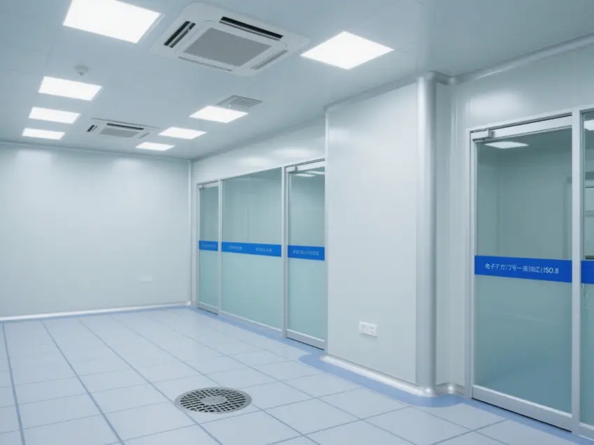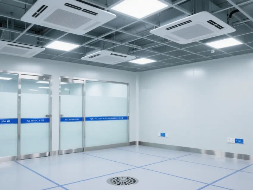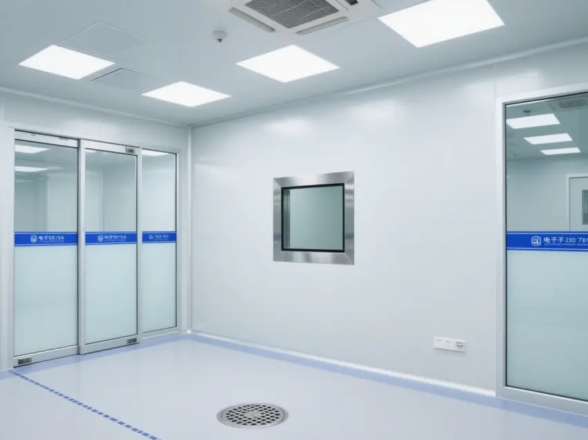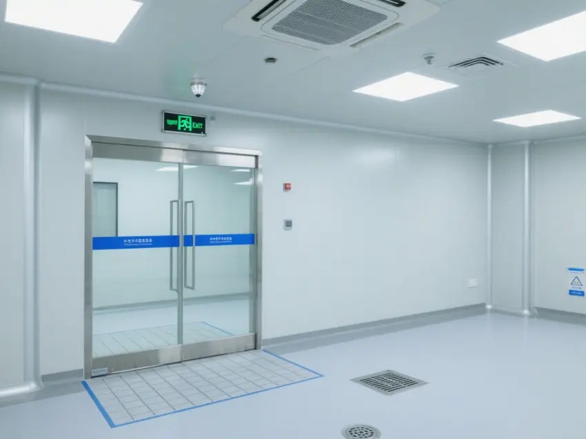 車間的天花板上安裝了多個方形的照明燈,提供充足的光線,同時還有通風設備,確??諝饬魍?,保持車間內的空氣潔凈度達到萬級標準。墻壁上有一些玻璃窗戶和門,便于觀察內部情況。