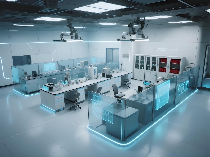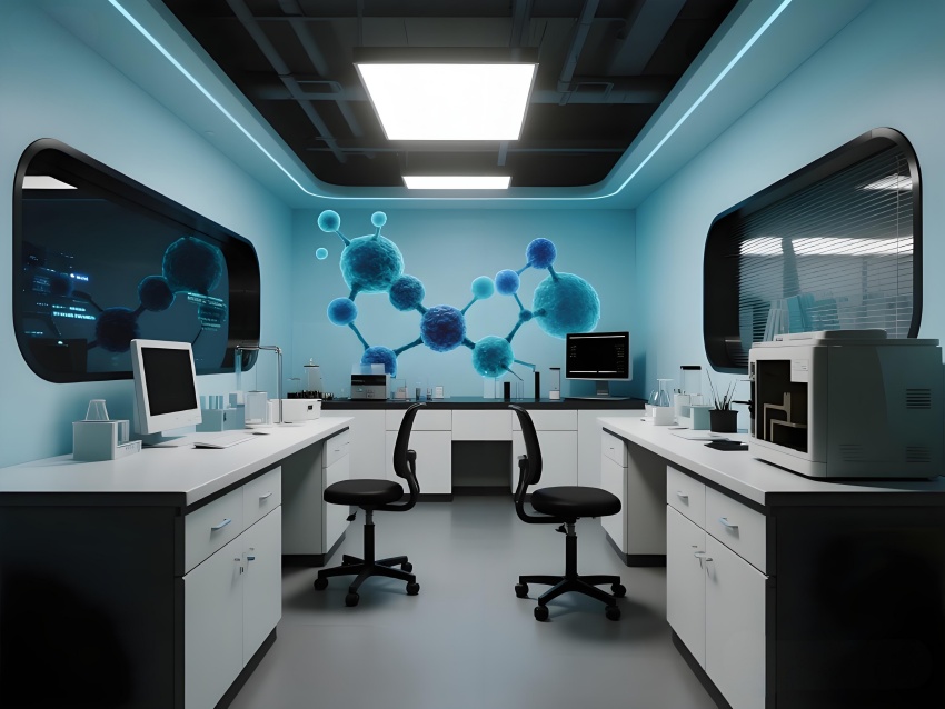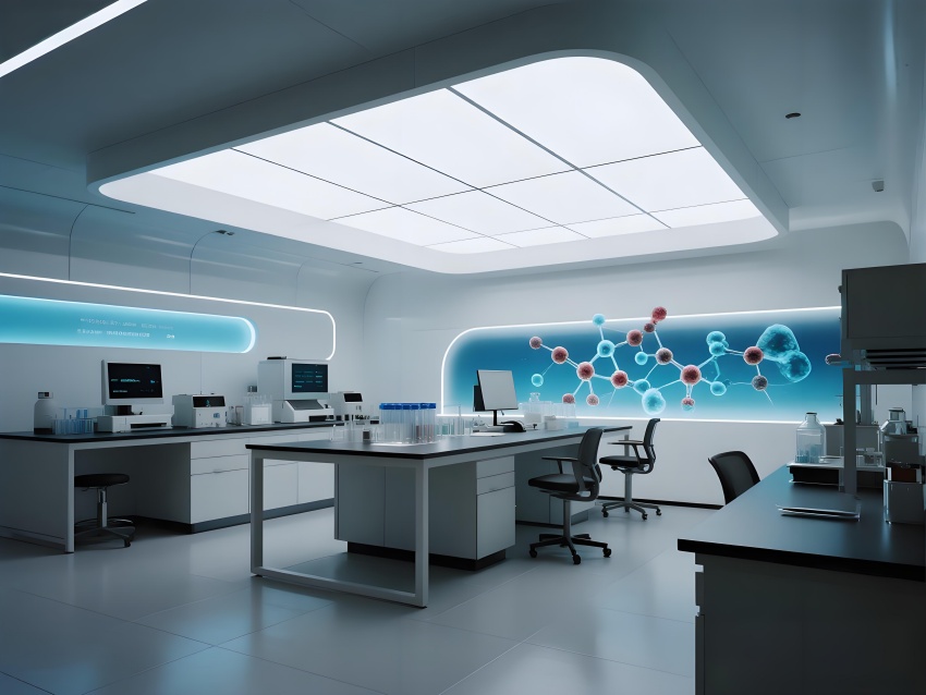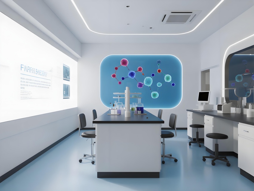 本設(shè)計(jì)以"科技賦能生命"為核心理念,構(gòu)建純凈高效的研發(fā)環(huán)境。主體采用冰川白與醫(yī)用藍(lán)的漸變配色,墻面嵌入動(dòng)態(tài)生物分子結(jié)構(gòu)LED裝飾,營造科研儀式感。實(shí)驗(yàn)區(qū)采用模塊化懸浮工作臺(tái),透明智能玻璃隔斷實(shí)現(xiàn)空間通透性與功能分區(qū)的完美平衡。頂棚的流線型送風(fēng)系統(tǒng)與地面熒光導(dǎo)視帶形成立體動(dòng)線指引。核心無菌區(qū)采用圓形穹頂設(shè)計(jì),搭配全息投影滅菌提示界面。數(shù)據(jù)分析中心配備曲面智能白板墻,實(shí)時(shí)可視化研究數(shù)據(jù)。?;反鎯?chǔ)區(qū)通過紅色光暈警示與物理隔離確保安全。整體空間融合醫(yī)療級(jí)潔凈美學(xué)與科幻實(shí)驗(yàn)室語言,在嚴(yán)謹(jǐn)中注入未來感,通過智能交互界面與人性化燈光系統(tǒng),打造國際一流水準(zhǔn)的醫(yī)藥研發(fā)矩陣空間。