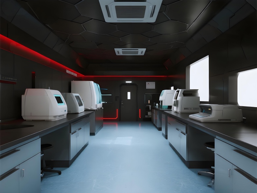 本實驗室采用"生物防御未來主義"風格,通過銳利的幾何切割與警示色彩構建科研防護美學。核心實驗區以啞光黑墻面搭配紅色應急光帶,形成視覺危險預警,與清潔區的冰藍色環氧樹脂地面構成強烈功能區分。設備區的金屬原色與透明PCR儀散熱孔展現工業精密感,天花板的六邊形送風單元與地面導流孔形成垂直氣流可視化。防爆玻璃觀察窗嵌入電子壓差顯示屏,氣閘室的黃色斜紋標識強化生物安全等級過渡。通過冷白光與設備界面藍光的層疊照明,在滿足BSL-2物理防護要求的同時,營造出科幻電影般的嚴謹科技氛圍,傳遞基因工程特有的精密與危險并存的特質。